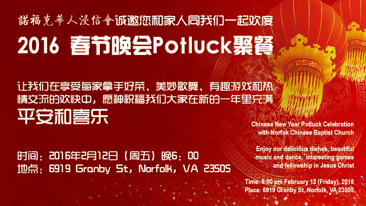 · 新闻 · 欢迎来诺福克华人浸信会 ·2026 新年蒙福! 诺福克华人浸信会 (Norfolk Chinese Baptist Church) 位于弗吉尼亚州的诺福克华人浸信会成立于25年前的12月。她的前身是成立于1901年5月5日的弗吉尼亚州弗吉尼亚比奇华人浸信会所支持的学生团契。 查看电子通讯:单击此处在 Microsoft Teams 上访问(首先下载 Teams) 报告事项 1.2026教会主题是日益更新 见证基督, 勉励经文:“所以我们不丧胆。外体虽然毁坏,内心却一天新似一天。”(哥林多后书 4:16);“并且穿上新人;这新人是照着神的形像造的,有真理的仁义和圣洁。”(以弗所书 4:24),季度重点实践, 更新心志。 主题经文:“不要效法这个世界,只要心意更新而变化。”(罗12:2)。 具体实施:每日灵修计划、祷告同伴、聘牧祷告月(1/19-2/18)。2.诺福克华人浸信会2026春节团拜在2月22日主日敬拜结束后举行,请提前邀请亲朋好友及慕道友参加。 天气预警! 由于预计本周日冬季风暴将影响我们地区,所有周日礼拜活动(包括主日学)都将通过 Zoom 平台在线举行。 本周敬拜和主日学 Zoom 信息 会议号:537 768 865 密码:016772 时间:上午 10:00–12:00 如需要上线协助,请联系教会同工团队。 未来的天气紧急通知将于主日前一天发布在: https://norfolkchinesebaptists.org 本周金句:“并 且 他 替 众 人 死 , 是 叫 那 些 活 着 的 人 不 再 为 自 己 活 , 乃 为 替 他 们 死 而 复 活 的 主 活 。” (哥林多后书5:15 )
